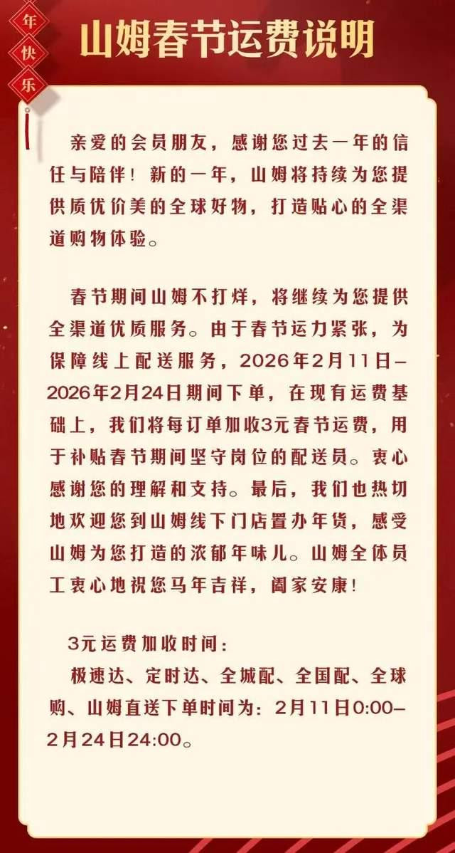 山姆发布春节运费说明称,由于春节运力紧张,为保障线上配送服务,2026年2月11日至2月24日期间下单,山姆线上配送在现有运费基础上将每单加收3元春节运费,用于补贴春节期间坚守岗位的配送员。