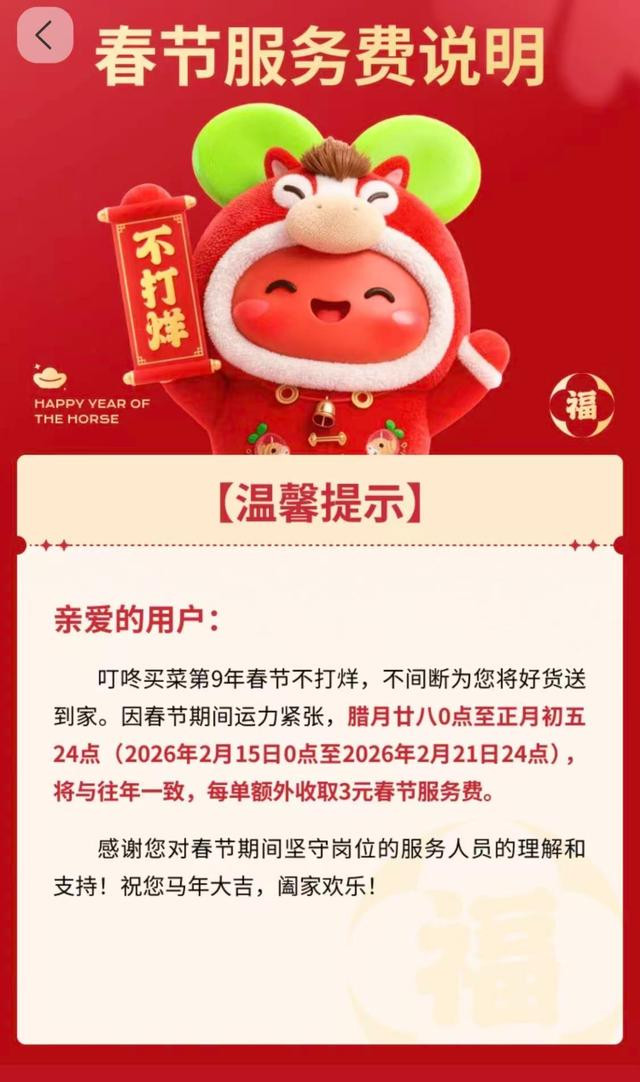 叮咚买菜也宣布,因春节期间运力紧张,腊月廿八0点至正月初五24点(2026年2月15日0点至2026年2月21日24点),将与往年一致,每单额外收取3元春节服务费。