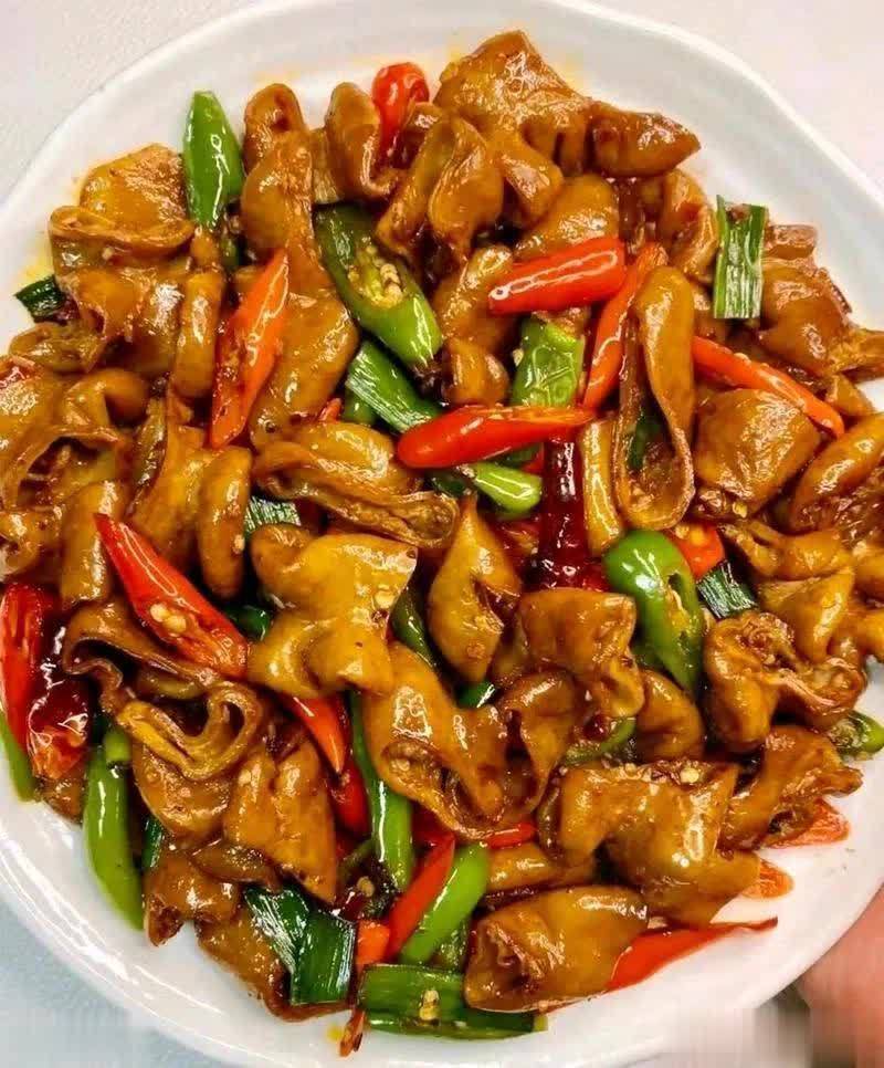 ③锅留底油放入半把蒜米 1把辣椒段 1小勺花椒,开小火煸炒出香味,倒入肥肠开中火快速翻炒,加入盐 味精 白糖 各1小勺,翻炒均匀淋入1勺麻椒油就可以出锅上桌了。