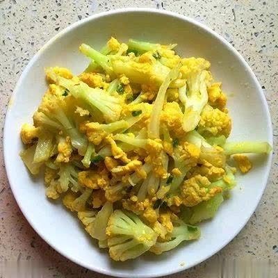7. 合并炒制:将炒好的鸡蛋倒回锅中,与花菜一起翻炒均匀,确保鸡蛋和花菜充分混合。炒至花菜和鸡蛋热透后,关火装盘。